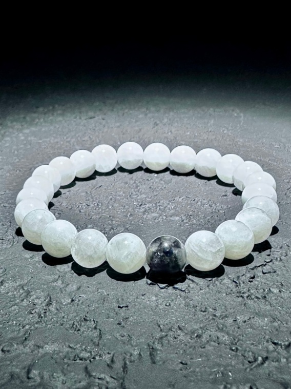 Delikatna bransoletka z mlecznobiałego kamienia księżycowego i subtelnego szarego koralika iolitu. Symbol intuicji, spokoju i łagodności.